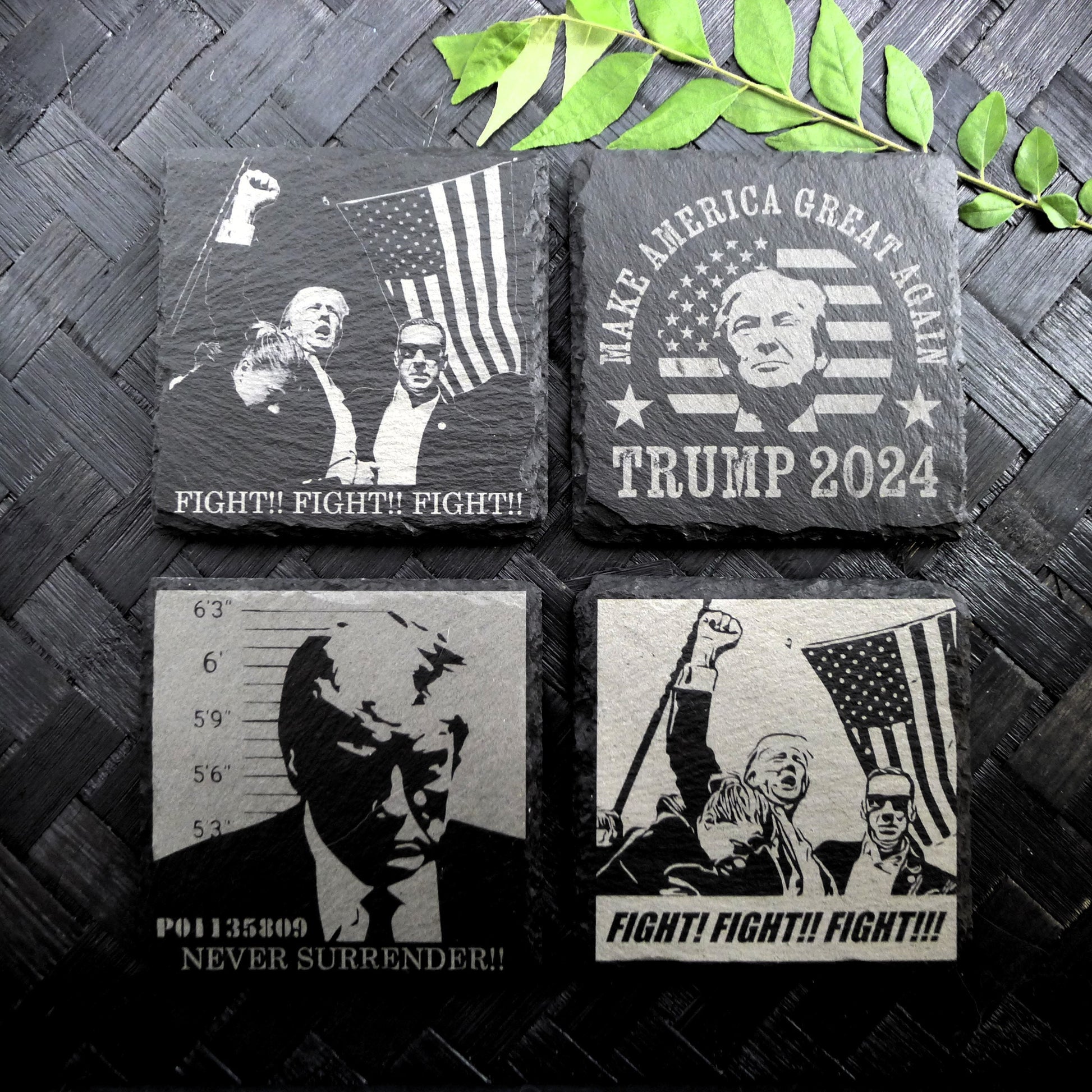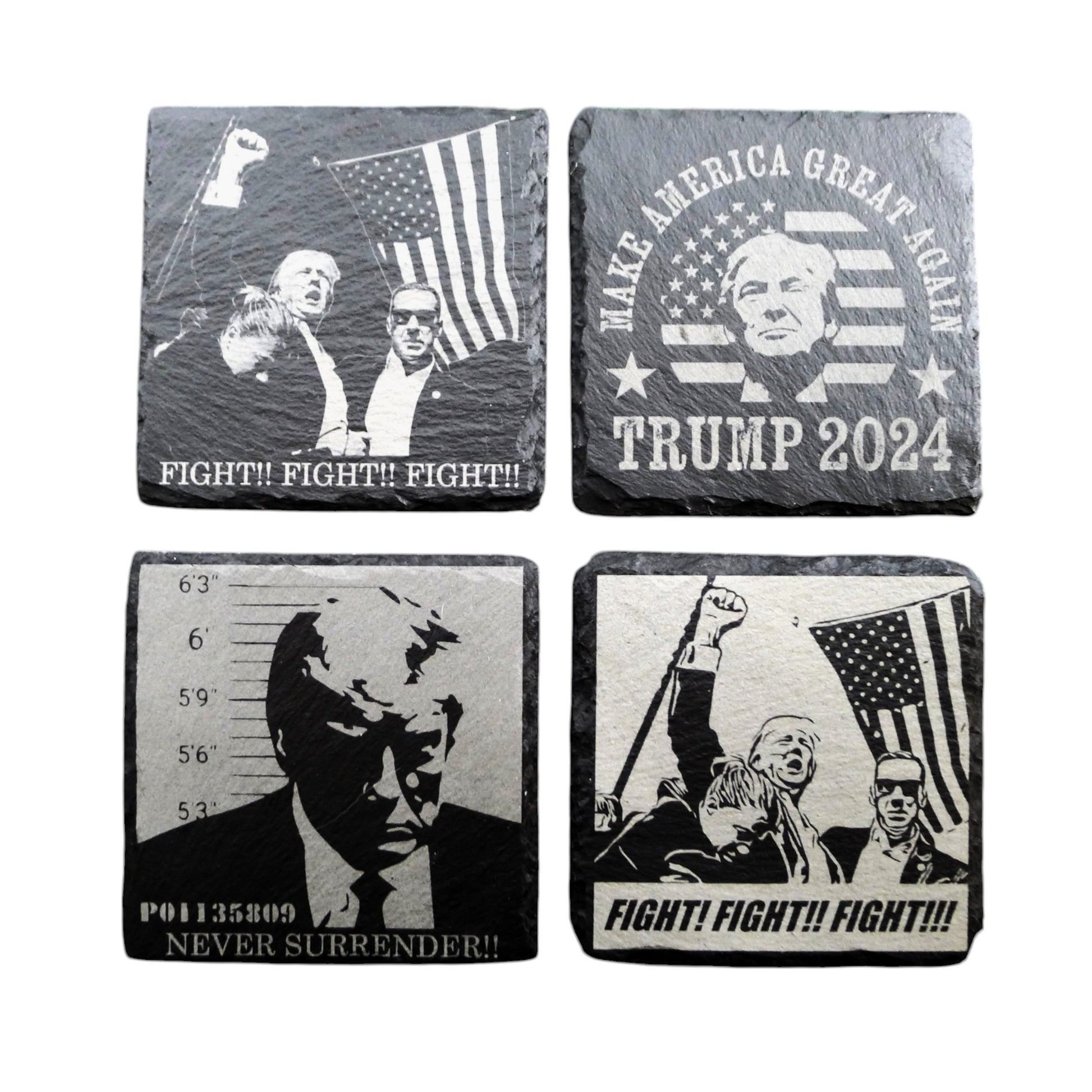 Features: Show your support with our Donald Trump 2024 - July 13 Assassination - FIGHT - Never Surrender Round Slate Coasters Set. These durable, engraved slate coasters feature bold, iconic designs, perfect for any supporter’s collection. Add a unique statement to your space while protecting your surfaces in style!
