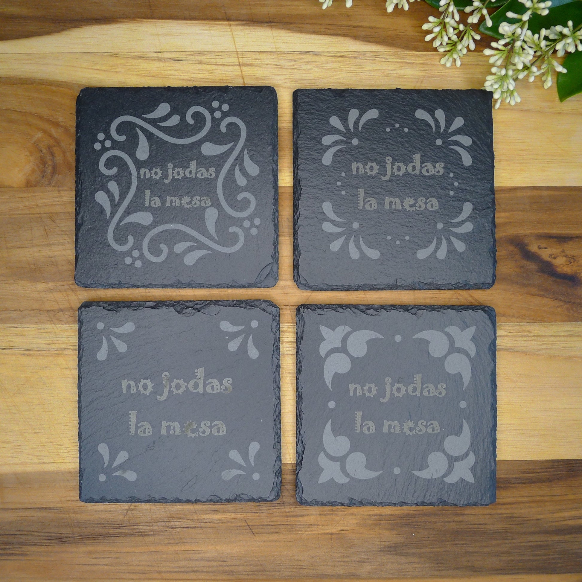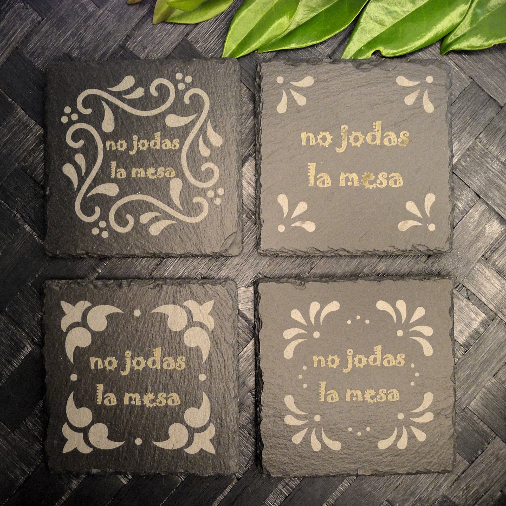Features: Add a touch of classical Spanish design to your home decor with our No Jodas La Mesa (Don't Fuck Up The Table) Slate Coaster Set. Perfect for entertaining guests or as a fun gift, this coaster set combines functionality with personality. Each piece is crafted from high-quality slate, ensuring long-lasting use and easy maintenance. Make every drink memorable with this unique and eye-catching addition to your home!